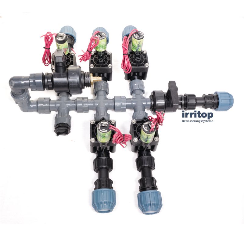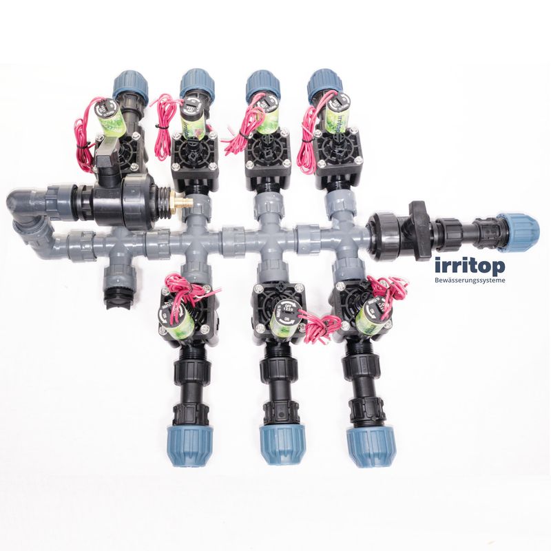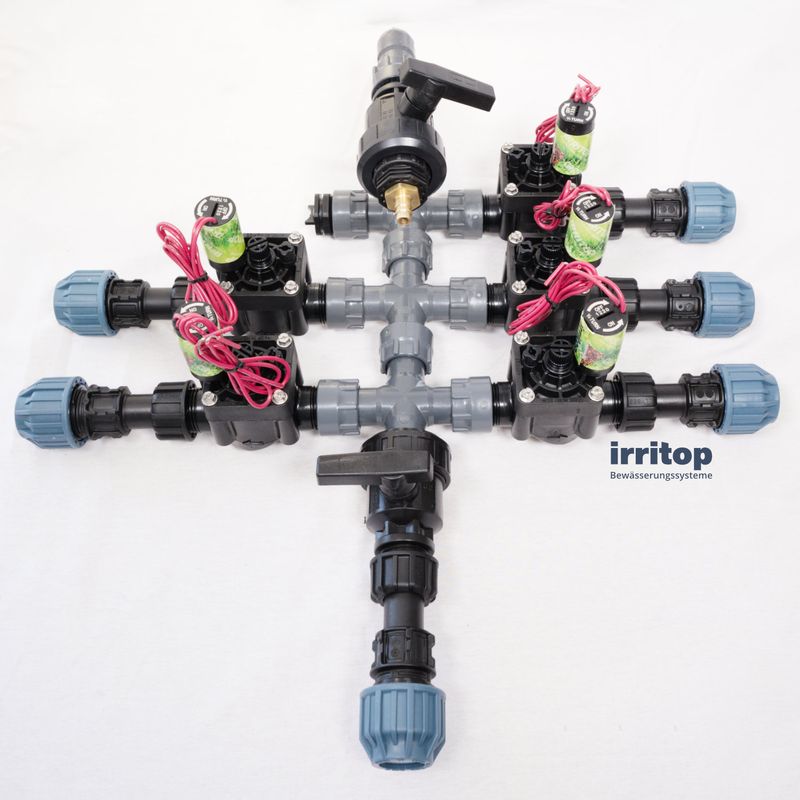 Ventil Verteiler verbinden die Magnetventile zu einem effizienten System. Die Multi-T-Verteiler haben 1" Innengewinde. Sie werden mit Überwurfmuttern mit O-Ring geliefert. Die Magnetventile können einfach und ohne zusätzliches Dichtungsmaterial installiert werden. Dank der Verwendung einer O-Ring-Dichtung kommt keine Leckage vor!