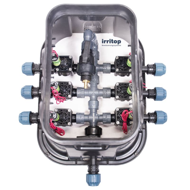 Am Eingang jedes Verteilers befindet sich ein 1" PP Kugelhahn. Mit diesem Kugelhahn kann der Verteiler von der Wasserversorgung abgetrennt werden. Dies erleichtert die Durchführung von Wartungs- und Reparaturarbeiten an den Magnetventilen.